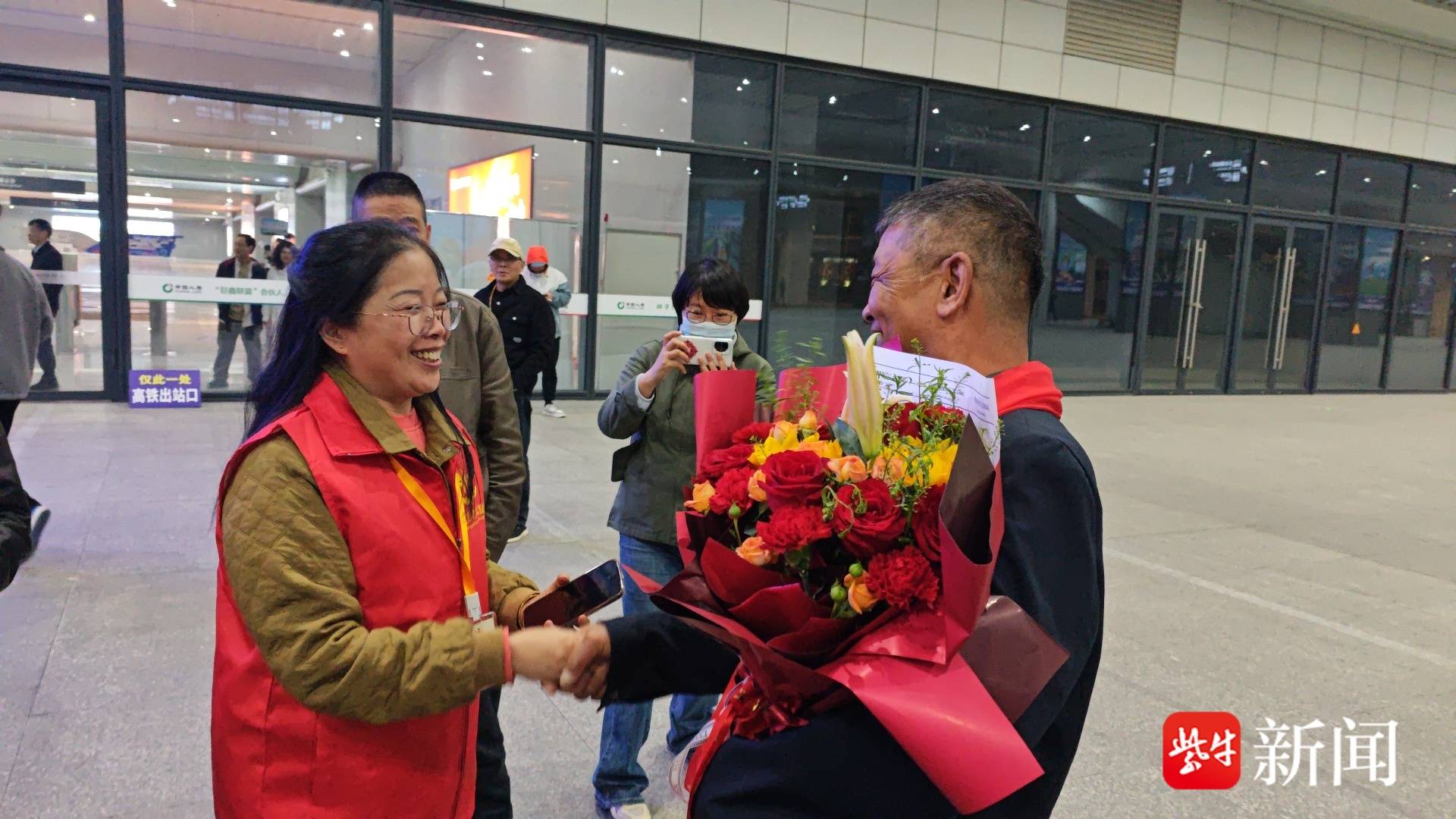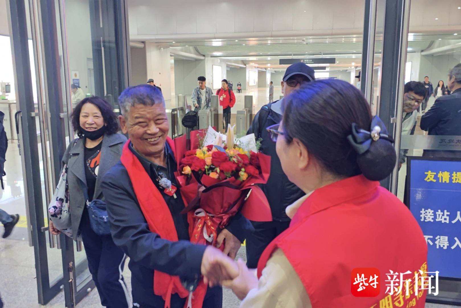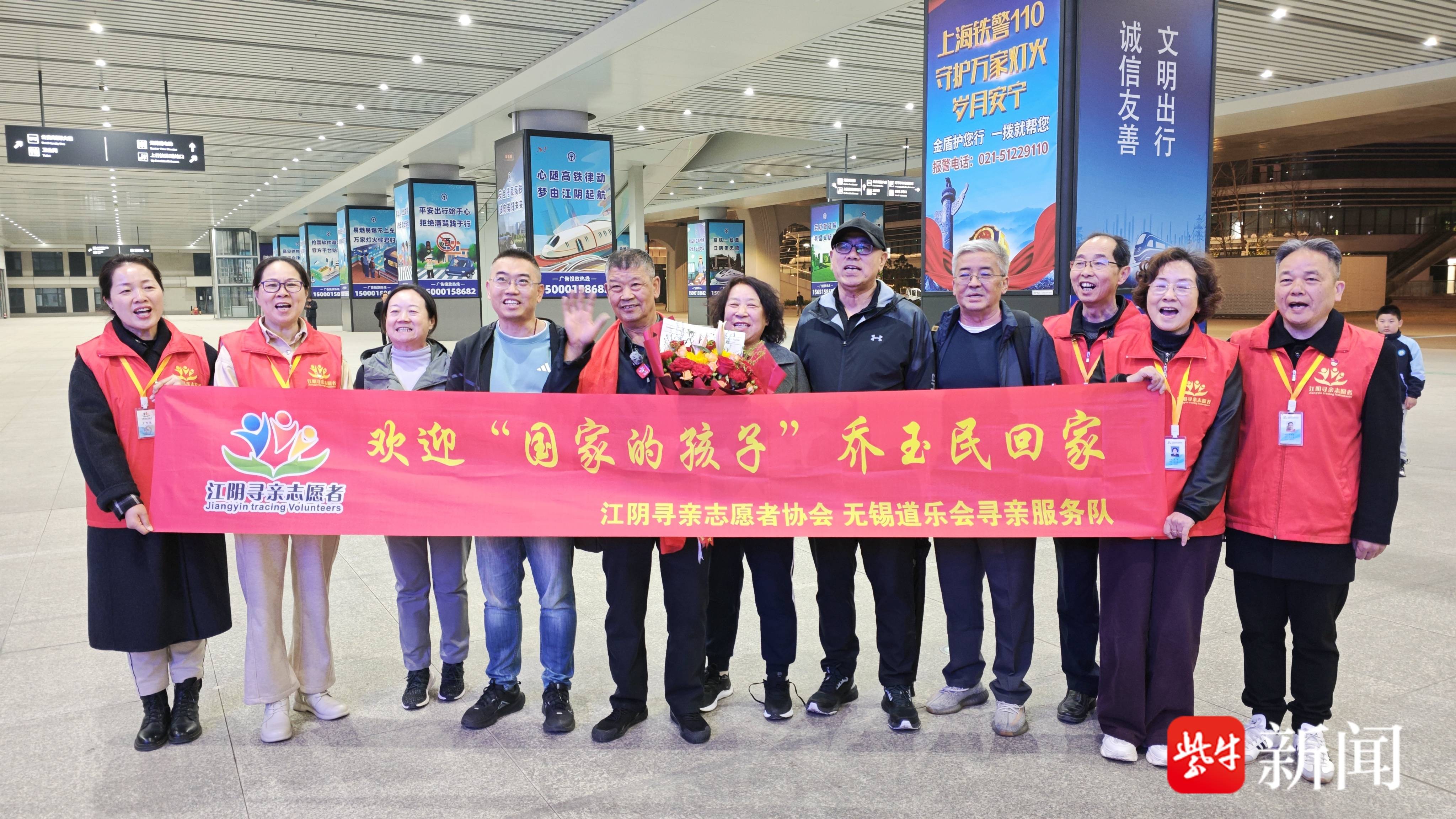 4月2日19时,乔玉民一家6人乘坐高铁来到了无锡江阴。刚出高铁站,江阴寻亲志愿者协会的志愿者就迎了上去,为乔玉民送上了鲜花和红围巾。此刻的他非常激动地说:“我终于回到了盼望几十年的地方。这是生我的老家,尤其是明天能够见到家人,让我感到非常开心。”
