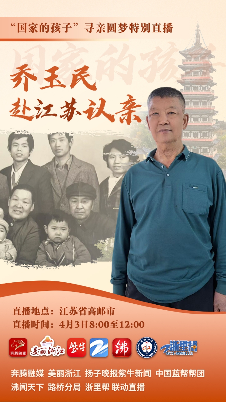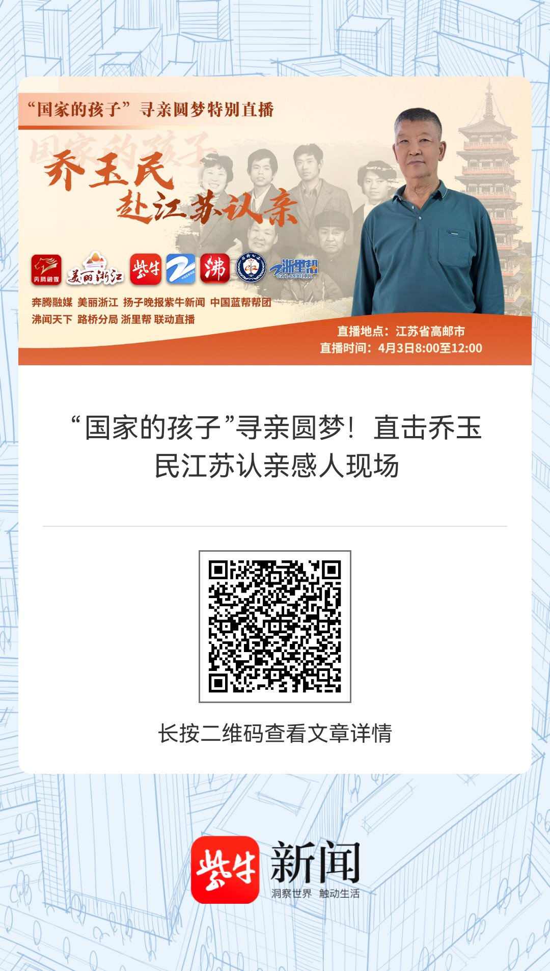 4月3日上午,乔玉民将与失散65年的亲人相见。扬子晚报/紫牛新闻联合奔腾融媒、美丽浙江、中国蓝帮帮团、浙里帮、沸闻天下等多地媒体现场直播,共同见证亲情重聚的泪目瞬间。